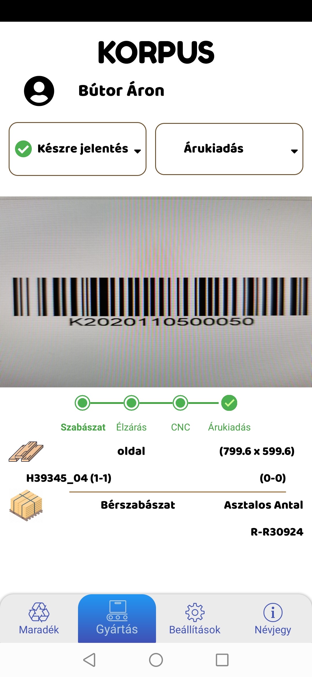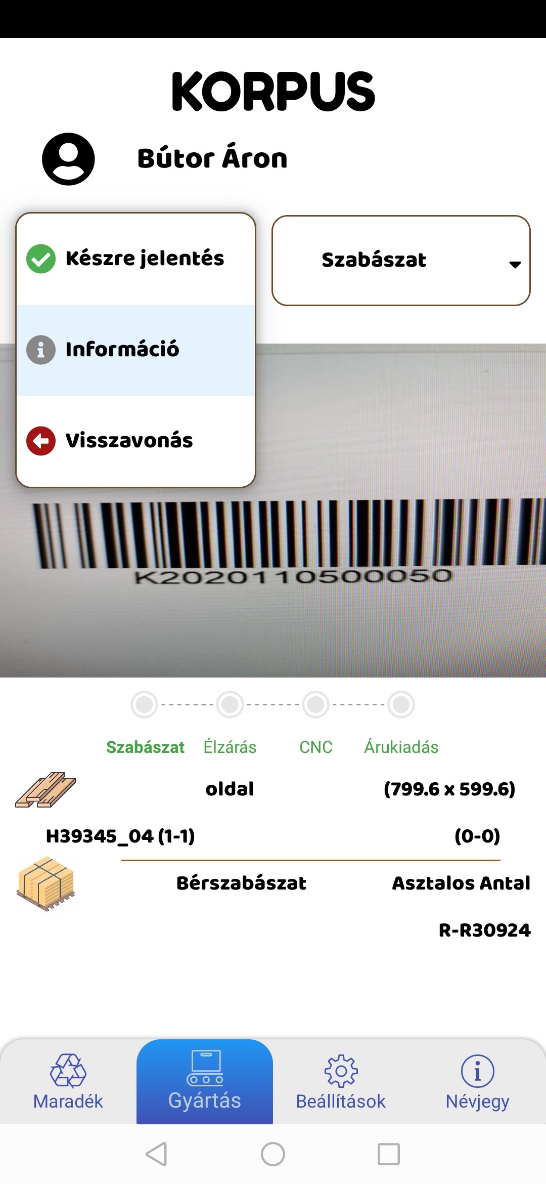 Gyártási folyamatok fázisainak regisztrálása és valós idejű nyomon követése a munkatársak által kezelt okostelefonon