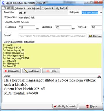 Összességében tehát, az előzetesen meghatározott paraméterek alapján a rendszer a későbbiekben képes ezen bútor elemeket „gumimodellként” kezelni, vagyis a bútor befoglaló méretei szerint meghatározni az alkotó elemeinek méreteit, élzáró, vasalat és munkadíj igényét. A szabványosított bútor elemek befoglaló méretei mellett, további, egyedi paraméterek definiálására is lehetősége van, melyeknek értékeit a konkrét megrendelés összeállításakor megváltoztathatja.